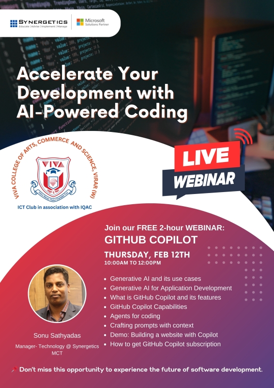 Step into the future of programming with this hands-on session designed especially for students who want to code smarter and faster using AI. Learn how GitHub Copilot, your AI coding assistant, can help you improve productivity, build applications efficiently, and accelerate your learning journey.